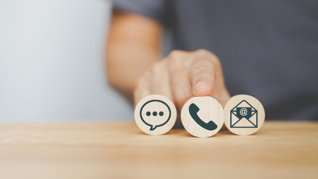 Contact us concept featuring wooden blocks and modern communication methods