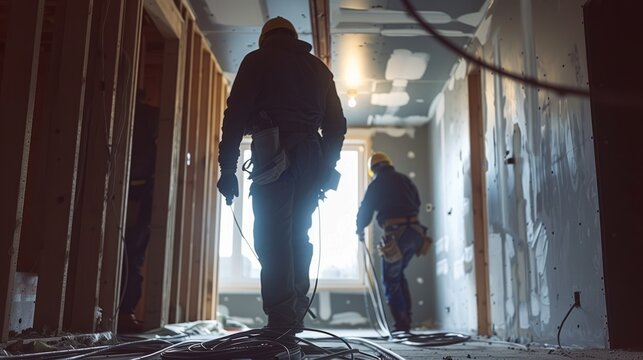 Workers installing electrical wiring and conduits inside the walls of a building, laying the groundwork for lighting, power, and communication systems