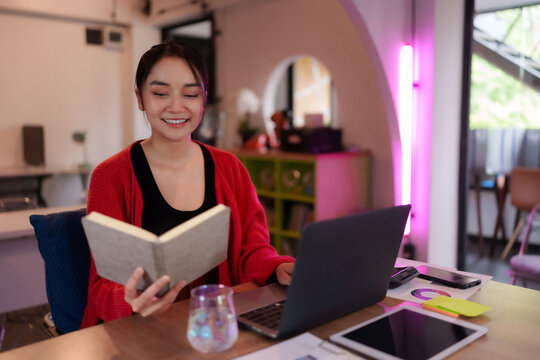 Asian adult freelancer woman productive learning working with laptop digital tools vibrant modern coworking space flexible remote environment