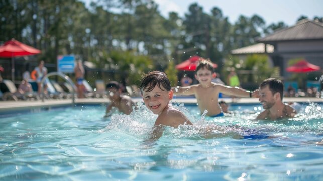 Cheerful family enjoys a sunny day at the local community pool, with kids playing and parents swimming in the background.