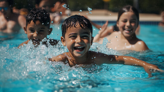 Parents and children swimming together in a community pool, splashing and having fun