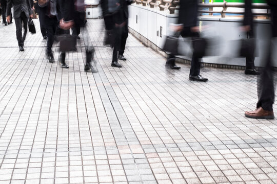 Commuters moving fast on city zebra crossing during rush hour