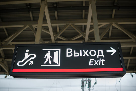 Sign Indicating Exit Directions at a Public Transportation Station With Escalator and Pedestrian Symbols Shown