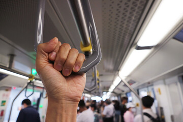 Closeup of a Hand Holding a Hanging Strap on the Commuter Train