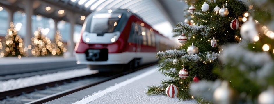 Train arriving at a station decorated for the holiday season with Christmas trees and lights on a snowy platform