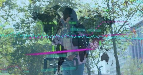 Urban commuter woman wearing mask holding bicycle on sunlit path with ar network overlay