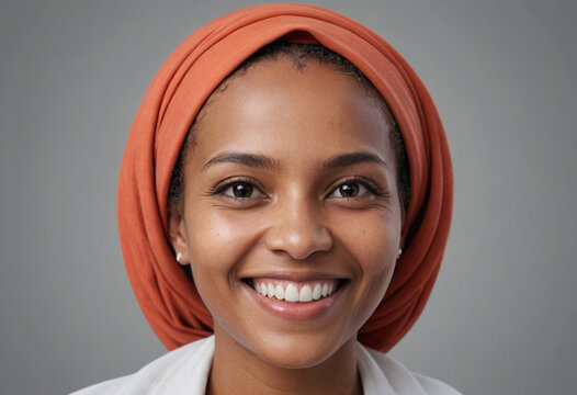 Portrait view of a regular happy smiling Comoros woman, ultra realistic, candid, social media, avatar image, plain solid background