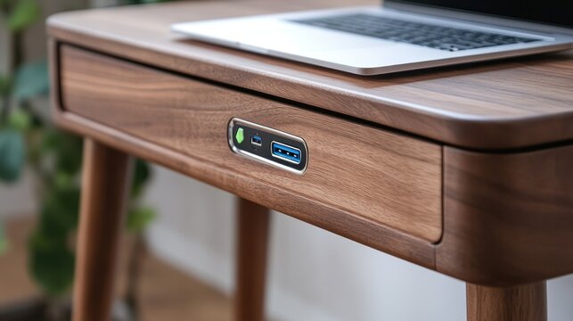 Modern wooden desk with built-in USB ports and laptop.