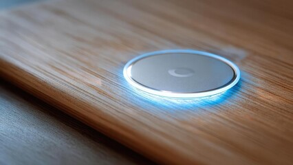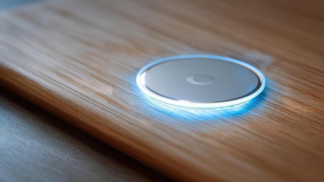 A round wireless charging pad on a wooden table with a blue glow around the edge. Concept Round wireless charging pad, Wooden table, Blue glow, Edge lighting, Modern tech desk