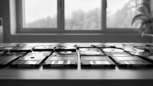 Vintage computer disks on a table near a window