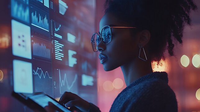 Businesswoman analyzing financial charts with floating 3d graphs, data panels and laptop