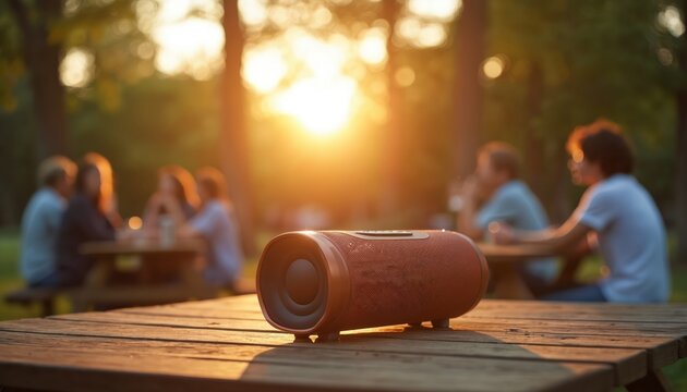 Portable speaker sits on wooden picnic table during sunset gathering. Friends enjoy music outdoors. Modern compact device offers clear loud bass quality sound. Wireless Bluetooth audio device perfect