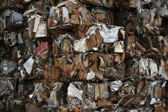 Large stack of crushed, compressed cubes or blocks of discarded iron metals for scrap metal recycling.