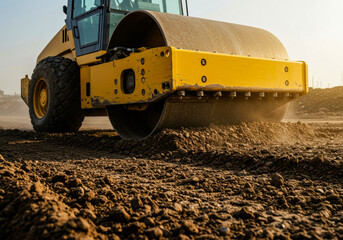 Heavy machinery compacts soil on a construction site during golden hour in the evening light