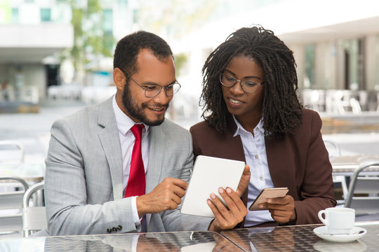 Positive colleagues comparing data on their gadgets screen. Business man and woman sitting in coffee shop, showing tablet and smartphone screens to each other. Comparing data concept