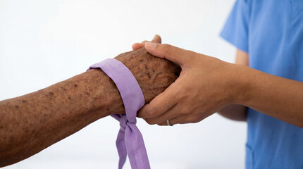 World Cancer Day-Young healthcare worker hand gently holding elderly patient wrist with purple band against white background, compassionate medical care trust support concept