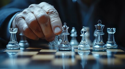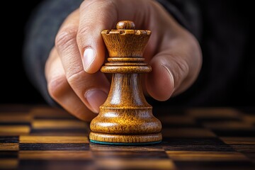 Hand poised over a wooden chess piece on a chessboard, symbolizing strategy and planning in the game of chess, showcasing the intensity of competitive gameplay