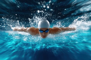 Competitive male swimmer in action performing butterfly stroke with water splashes and bubbles du training in indoor swimming pool with goggles and swim cap
