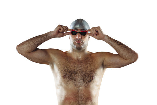 Professional caucasian male swimmer with hat and goggles practicing and training isolated on white studio background. Grace of motion and action. Healthy lifestyle, sport and movement concept.