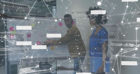 Colleagues discussing business strategy with augmented data overlay in modern open office
