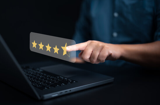 Customer feedback satisfaction survey concept. Customers use laptop and point happy smiley icon. Satisfied, 5 Stars, Service experience rating. Online complacency Review application, Checking quality.