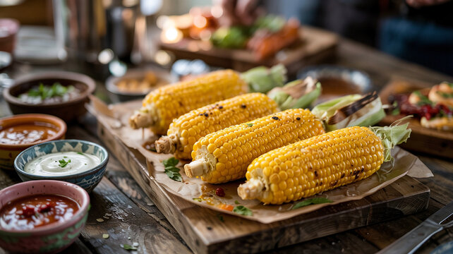 He prepares an assortment of sauces to complement th grilled corn on the table