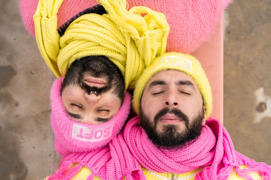 Portrait of bearded gay couple wearing caps with the word 'soft'