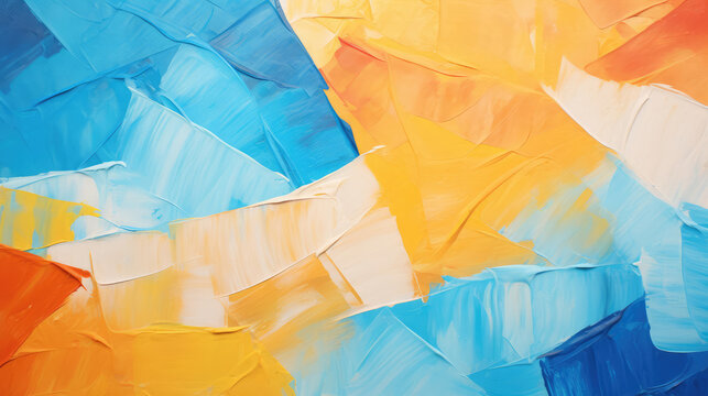 Closeup of abstract rough colorful blue orange complementary colors art painting texture background wallpaper, with oil or acrylic brushstroke waves, pallet knife paint on canvas, Generative AI