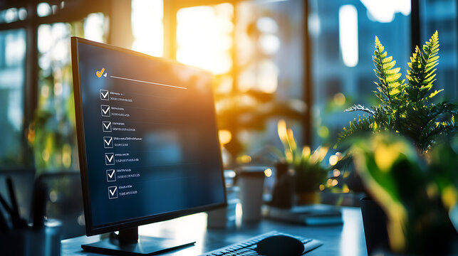 A computer monitor with a checklist displayed on the screen. The monitor is on a desk in an office setting.
