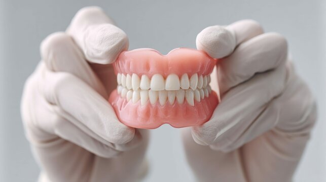 Gloved hands display a set of gleaming, complete dentures, emphasizing dental health.