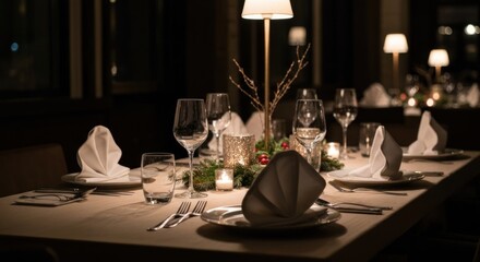 A dimly lit dining table set for an elegant meal, complete with glasses and folded napkins