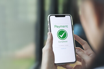 Payment complete Notifications. Customer using online banking application on smartphone to pay for purchases online and product in department store