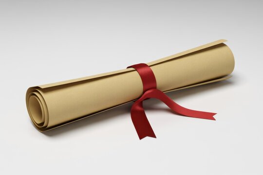 Rolled-up white paper tied with red ribbon on neutral surface symbolizing academic achievement