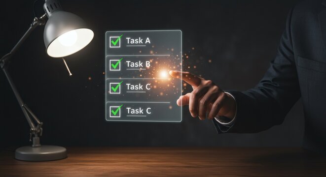 Person s hand touching a digital checklist with four completed tasks and progress indicators on a dark background