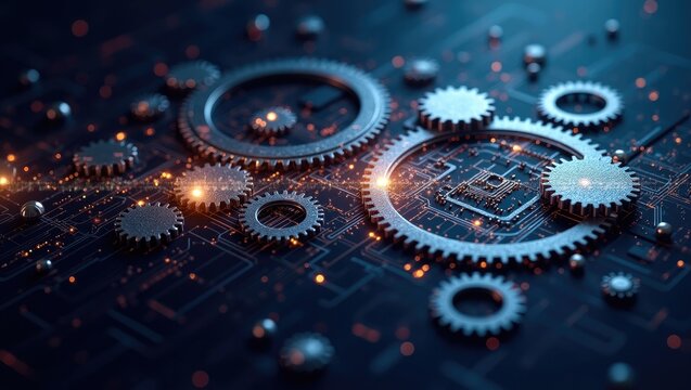 Metallic gears of various sizes are arranged on a circuit board with a dark blue background, illuminated by small, sparkling orange lights, indicating a futuristic technological concept.