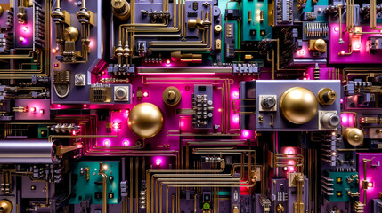 Gears and circuit board in glowing neon light.