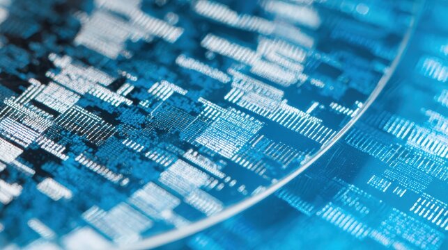 Close up view of digital circuit board showing complex patterns in blue and silver tones