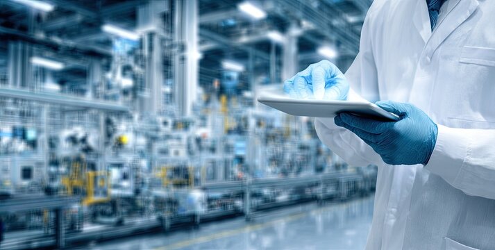 Scientist in factory, conducting research and development, industrial manufacturing.