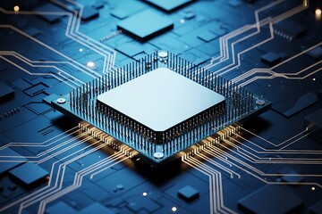 Intricate close up of a glowing central processor chip with complex circuitry and pathways illuminated in vibrant blue and gold hues
