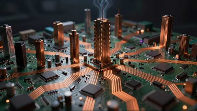 Futuristic circuit board design with glowing interfaces and electromagnetic waves