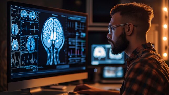 Neurologist Examines Intricate Brain Scans on Multiple Screens. Advanced Neuroimaging Technology Reveals Complex Neural Pathways, Display Showing CT Scan in a Modern Medical Environment