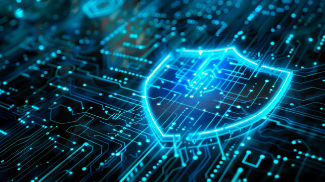 glowing blue shield symbol superimposed over a complex circuit board, representing concepts of cybersecurity and data protection in the digital age.