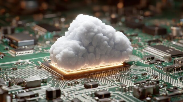 Cloud Computing Concept: Abstract close-up of a digital cloud icon hovering over a complex circuit board, symbolizing the power and connectivity of cloud computing technology.