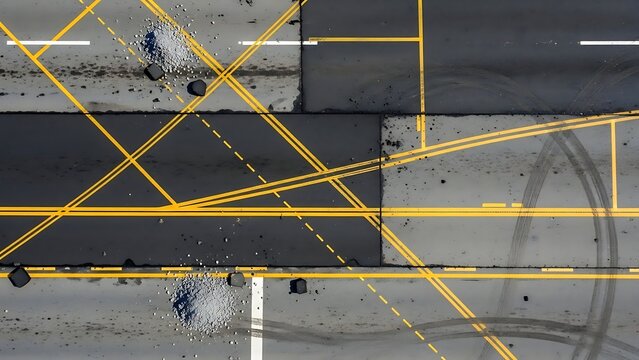 Aerial perspective of a complex network of yellow lines and tire marks on asphalt, revealing intricate road patterns and surface wear in an abstract urban infrastructure