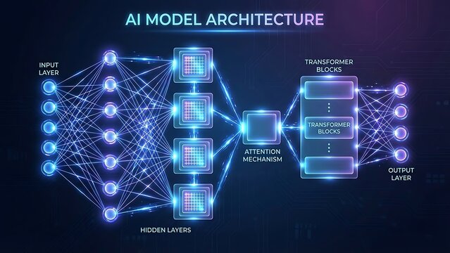 AI Model Architecture: An abstract depiction of an AI model's architecture, showcasing the complex interplay of layers, blocks, and mechanisms. Illuminating the core of modern machine intelligence.