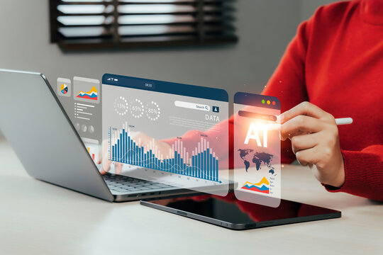 Data analysis science and big data with AI technology. Analyst or Scientist uses a computer and dashboard for analysis of information on complex data sets on computer. Insights development engineer