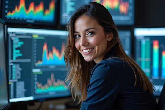 Data scientist analyzing complex datasets on multiple screens in a research lab.