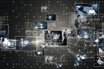 Complex digital ecosystem with interconnected professional media platforms on a grid background