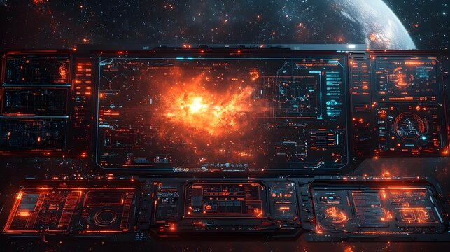 A visually stunning digital display showcasing a complex network of cyber security overlays intricate icons and a captivating deep space background