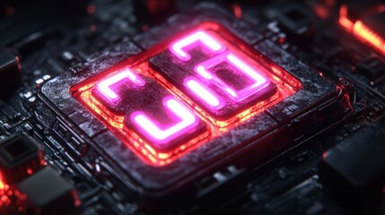 Glowing numerals on circuit board. Tech, data, and illumination elements visible